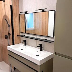 Les lignes épurées, associées à une palette de couleurs naturelle, confèrent à la pièce un style élégant et apaisant, idéal pour un espace de détente comme la salle de bain.